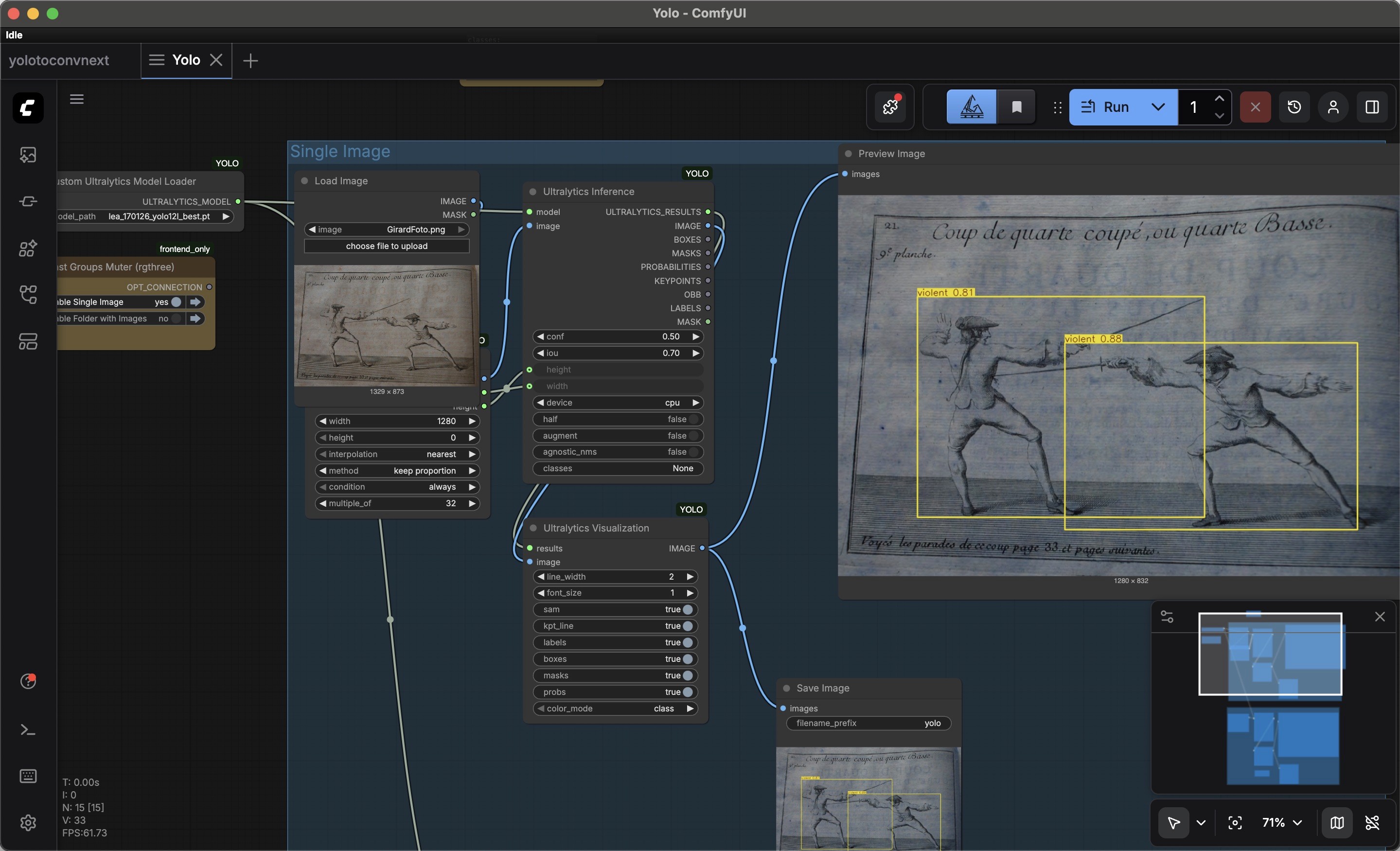 Abb.21: Ansicht des Interfaces von "ComfyUI". Foto: Lea Karnutsch. In Interface zu sehen: Jacques François Girard: L'Academie de l'homme d'épèe ; ou La science parfaite des exercises deffensifs et offensifs. La Haye: van Duren 1755.